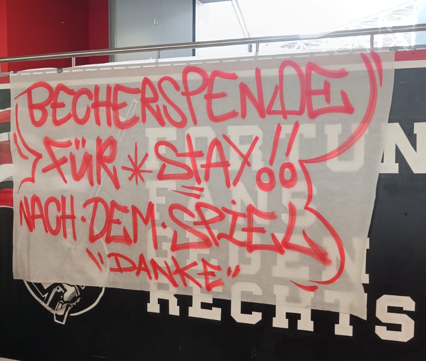 Zahlreiche engagierte Fans von Fortuna Düsseldorf unterstützten uns gestern beim Spiel gegen Holstein Kiel und baten nach Spielende gemeinsam mit uns auf der Südtribüne um die leeren Pfandbecher. Die bittere Niederlage tat der Spendenbereitschaft zum Glück keinen Abbruch und so kamen insgesamt 7000 € zusammen. Geld, das uns hilft, die massiven Kürzungen in der Finanzierung unseres Projekts Medinetz ein wenig abzufedern.
